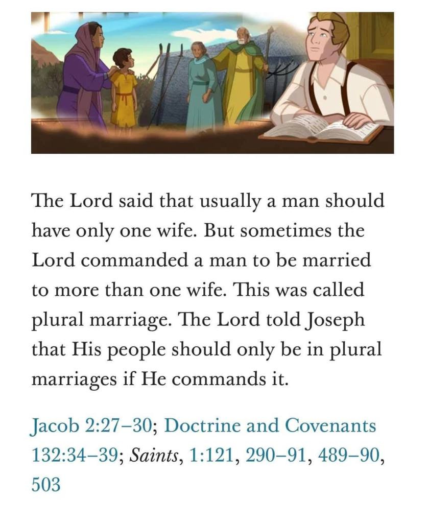 I’ll set aside the reality that this paragraph is far from transparent and focus on that tiny, five-lettered word “still,” which means, in this context, “up to and including the present moment” (Oxford Dictionary). It contains no guarantee that monogamous marriage will continue to be the commandment of God, especially because the subtitle of the story calls plural marriage a “law.” In LDS theology, a law has more weight than a commandment, being eternal, but most young children won’t know this. In time, however, they will learn.