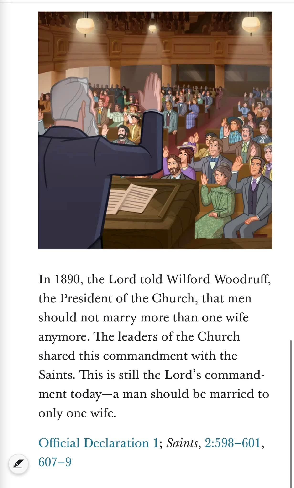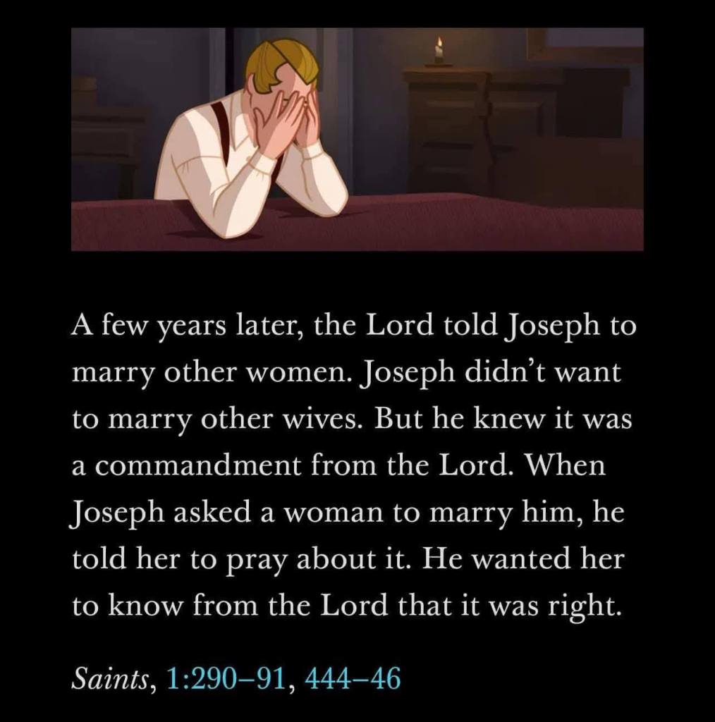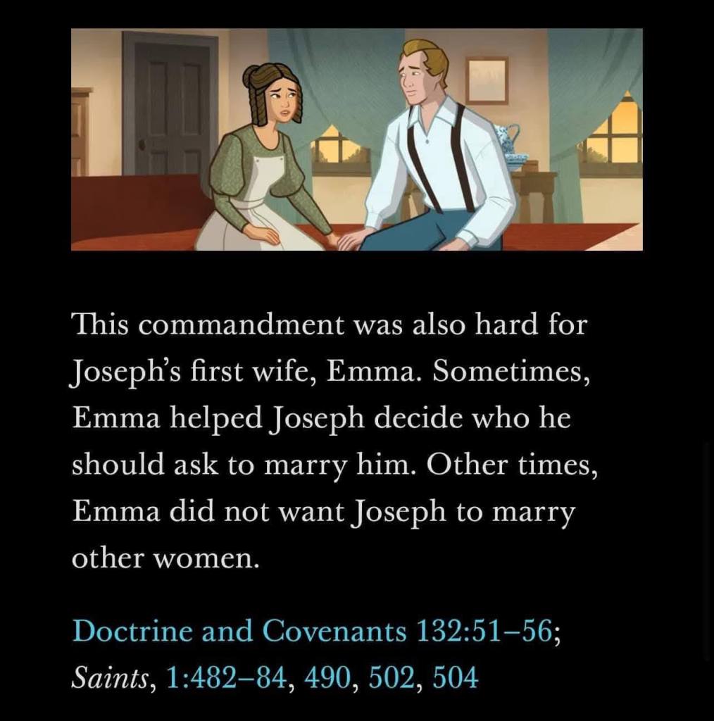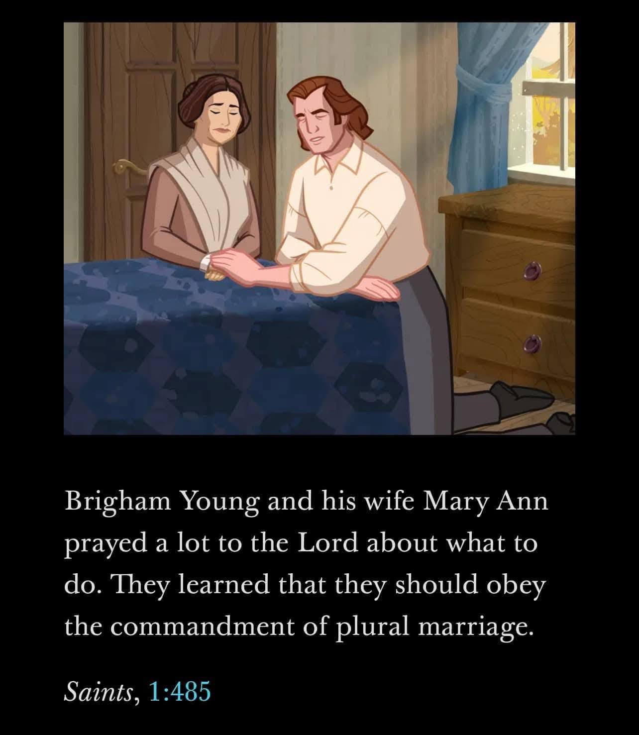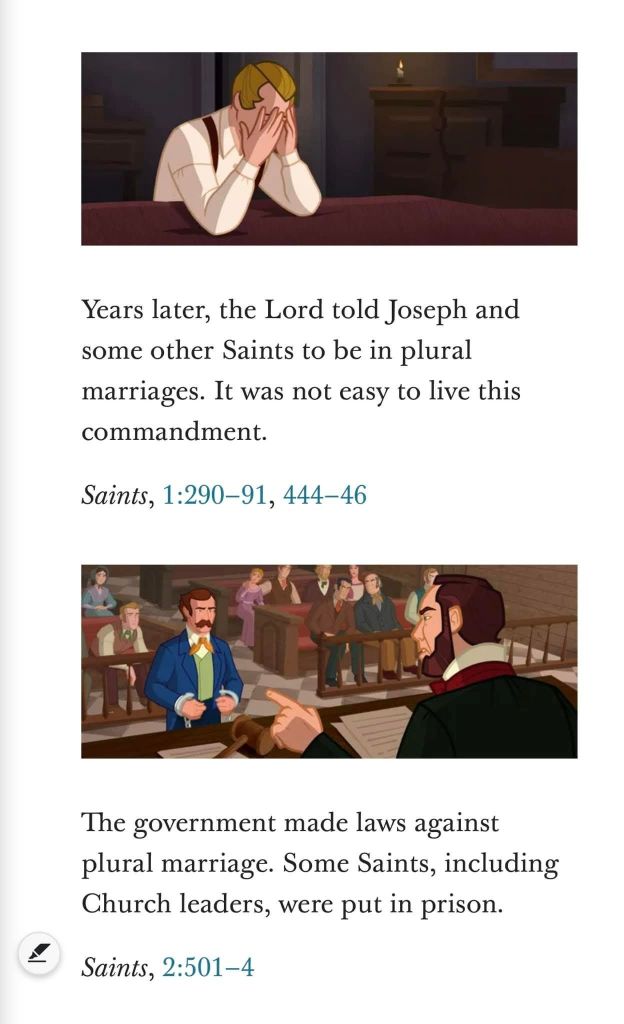 IF YOU NEED MORE EVIDENCE that polygamy culture is alive and well in the contemporary sphere of the LDS, look no further than your gospel library app, specifically at the new picture story published in the Doctrine and Covenants Stories for Children, titled “Plural Marriage: Faith to Obey a Law from the Lord Even When It’s Hard.” (Find it here.***) It provides a carefully curated cartoon version of early Mormon polygamy, stretching from its beginnings with Joseph Smith to its mythologized ending with Wilford Woodruff’s Manifesto, all in just eight panels. To say much is omitted is an understatement. However, its purpose isn’t to teach history but to use well-washed nuggets of fact to tightly define faith as obedience to God through obedience to priesthood authority. That may be the intent, but it seems destined to undermine the mental health (aka the emotional and spiritual well-being) of the children of devout Latter-day Saints, including those in the most secure of homes, by destabilizing their concept of marital boundaries.